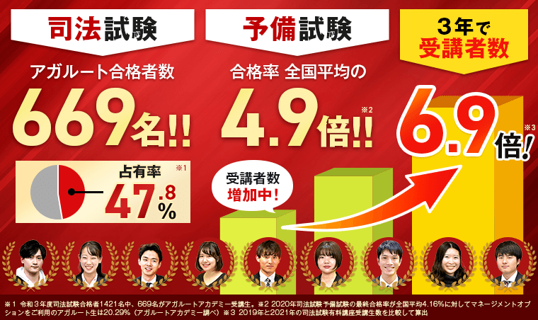 司法試験予備試験講座ランキングでトップクラスの資格スクエアは、予備試験受験生の多くが利用しており、教材、学習ツール、サポート、受講料など総合的に高く評価されています。つづいてアガルートアカデミーは、初学者が最短ルートで予備試験に合格できるカリキュラムを提供しています。2019年度は司法試験合格者1,502人中523人(34.8%)の実績を誇り、年々、合格率上昇しているオンライン予備校になります。